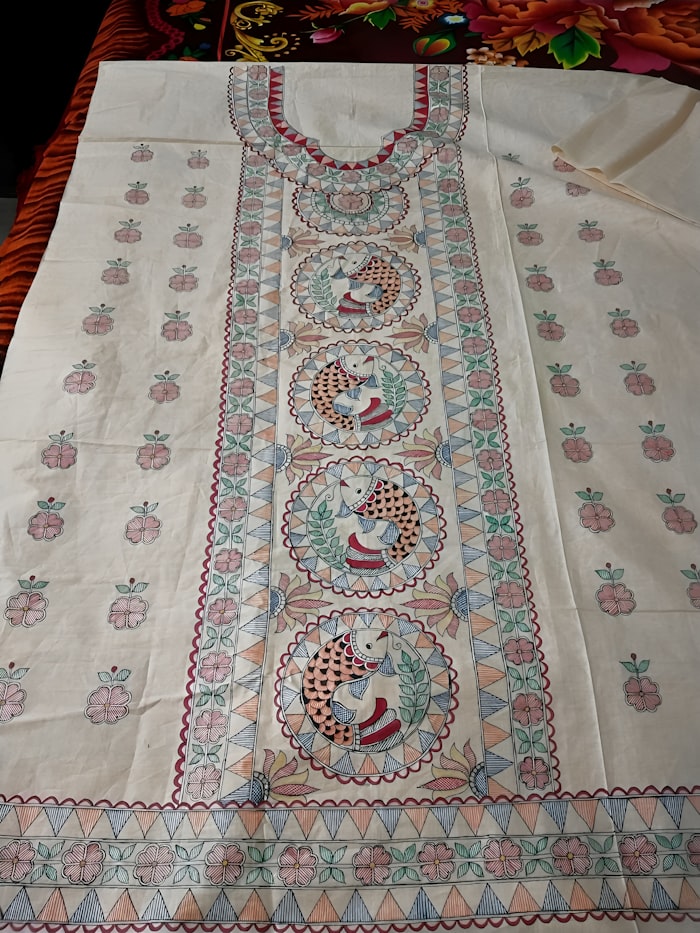 A beautifully handcrafted silk unstitched kurti featuring fish and flower-themed Madhubani art, showcasing intricate traditional detailing.